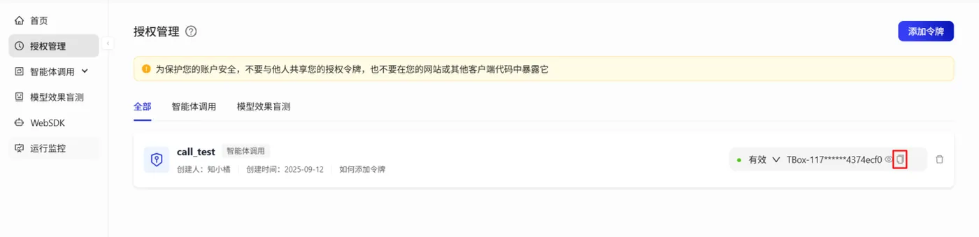 注意:为保证您的数据安全,请勿将令牌信息泄露给他人或暴露在浏览器、客户端。