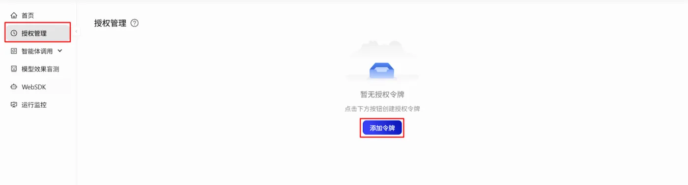 - 在平台首页,点击左侧导航中的授权管理 > 添加令牌。