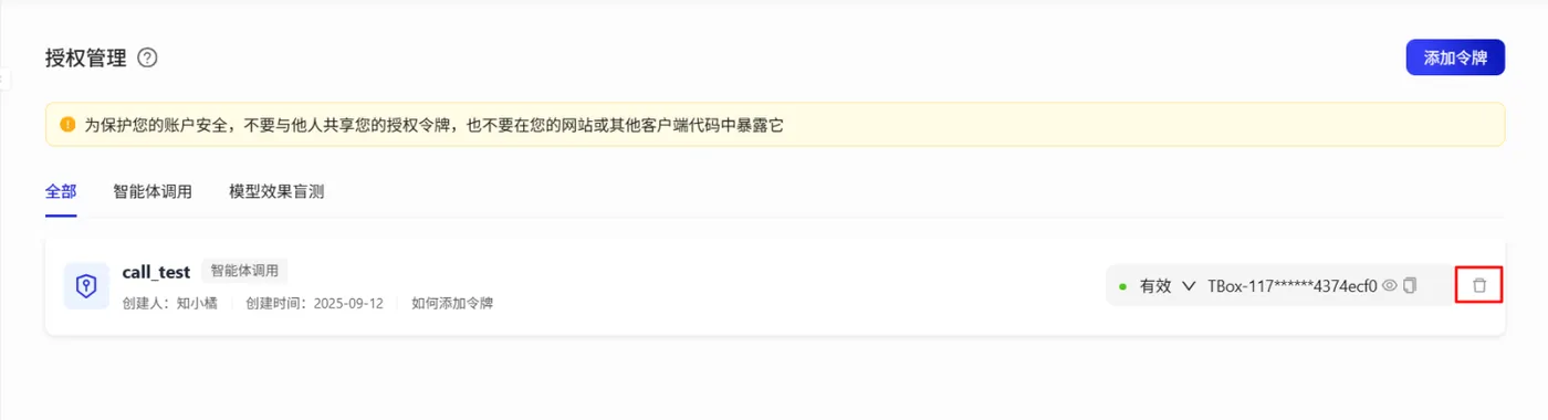 - 删除令牌:在授权管理页,点击令牌列表右侧的 ,即可删除目标令牌。