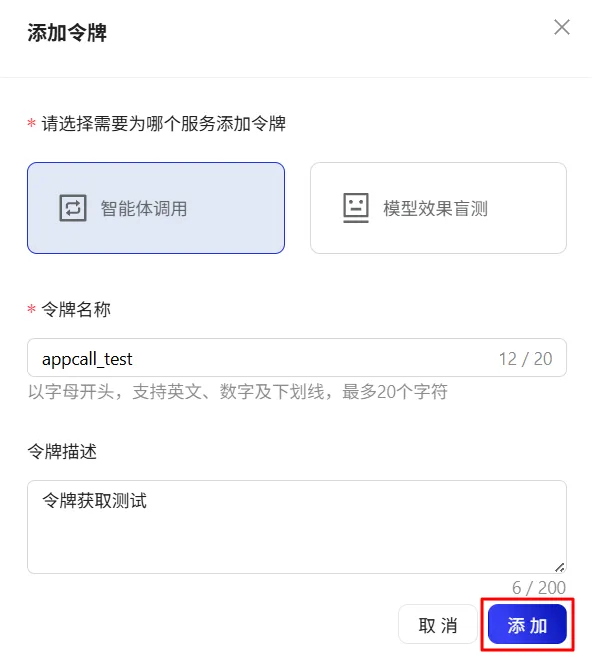 - 在添加令牌面板中,根据业务需求选择令牌类型并完成名称、描述的配置后,点击添加。