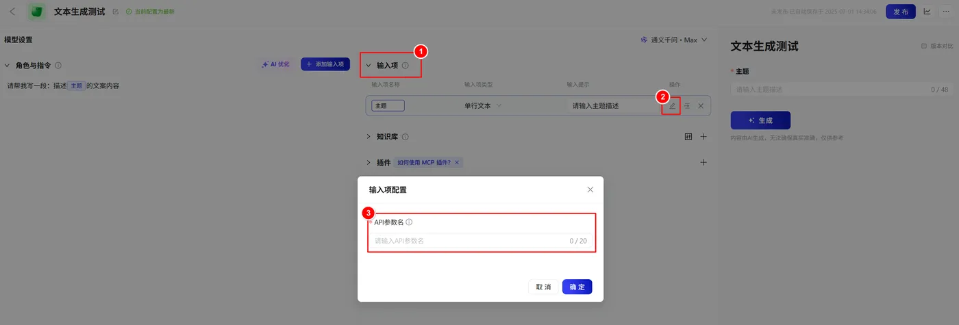 指在智能体输入项中自定义的 API 参数名。 获取路径:生成型智能体配置页 > 输入项 > 目标参数 > API 参数名。 |