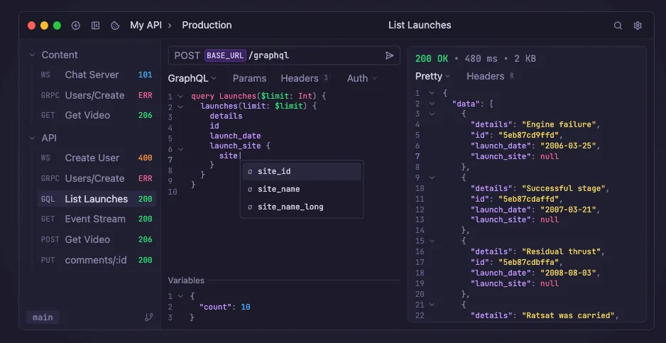 然后在 UI 里选择请求,切换环境变量,一键运行 REST 或 GraphQL。