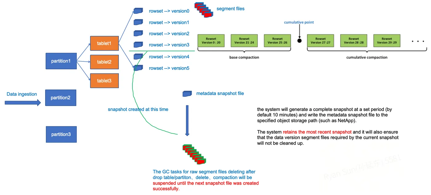 如上图所示,针对每个 tablet 的数据导入都会产生一个对应版本的 rowset。对于已经包含在未删除的 metadata snapshot 的 tablets,涉及到因为 drop table/partition、delete、Compaction 等操作需要后期 GC 删除无用文件的 GC 任务会在下一个 metadata snapshot 生成之前被阻塞,从而确保当前快照所需的数据版本不会被清理。