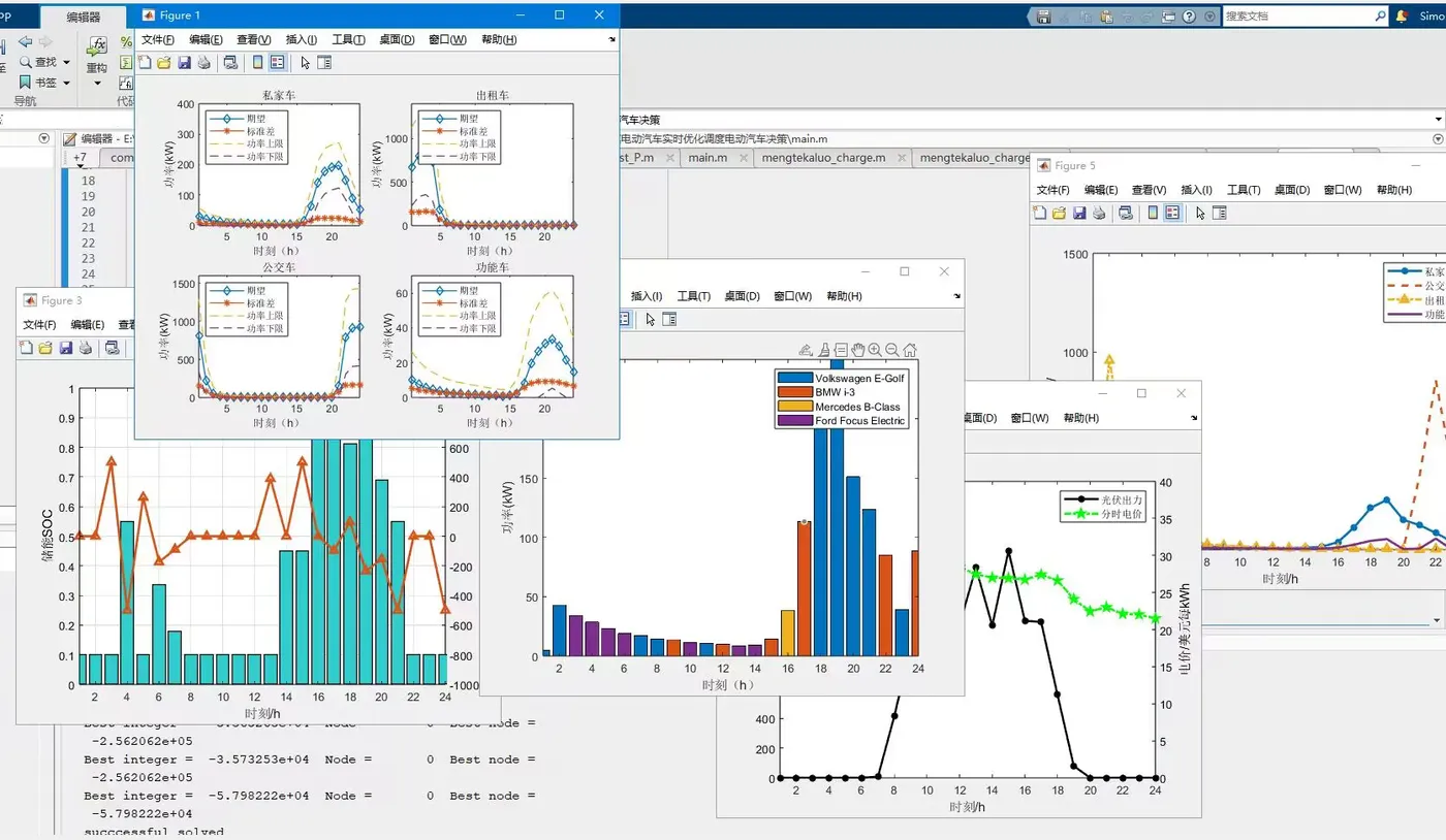 设置一个具有大规模双向充电桩的新能源微电网仿真场景,包含多种类型的电动汽车,如私家车、公交车、出租车等。模拟不同时间段的新能源发电功率、基本电力负荷以及电动汽车的出行和充电需求。