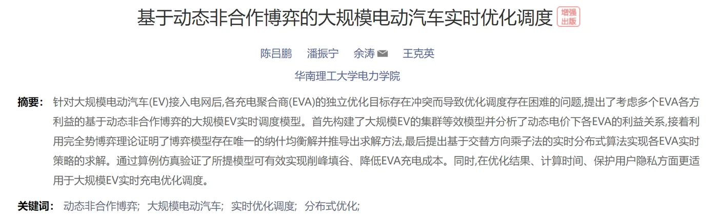 [1]陈吕鹏,潘振宁,余涛等.基于动态非合作博弈的大规模电动汽车实时优化调度[J].电力系统自动化,2019,43(24):32-40+66.