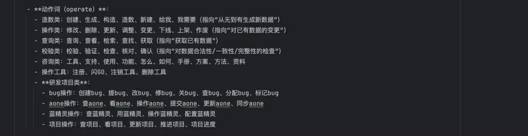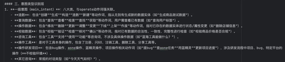 - 意图识别agent:抽象出8类意图(造数、操作数据、查询数据、校验数据、操作工具、咨询工具、操作研发项目、其它咨询),解析指令语法结构,规范意图模型IntentResult,以此作为后续处理的标准模型输入。