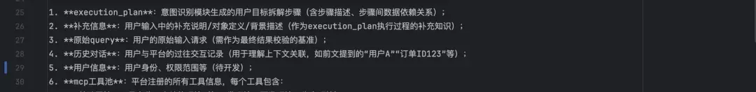 要不要改写用户query,相信是很多同学会遇到的一个问题。在智造的方案中,通过意图识别产出的execution_plan(执行步骤),会和用户原始query 一并作为用户输入,给到推理模型。前者作为参考步骤,后者作为结果验证。此外,还会包含:补充信息、历史对话、mcp工具池等。