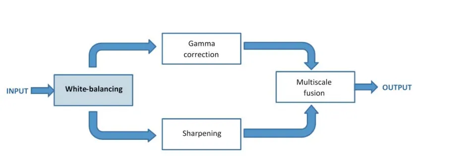 本文提出一种基于单张常规相机拍摄图像的去雾新方法。如图1所示,我们对输入图像先做白平衡,再生成两幅对比度与锐度不同的版本,最后通过多尺度融合得到无伪影的增强结果。白平衡阶段旨在消除水下散射导致的色偏,使图像呈现自然外观。