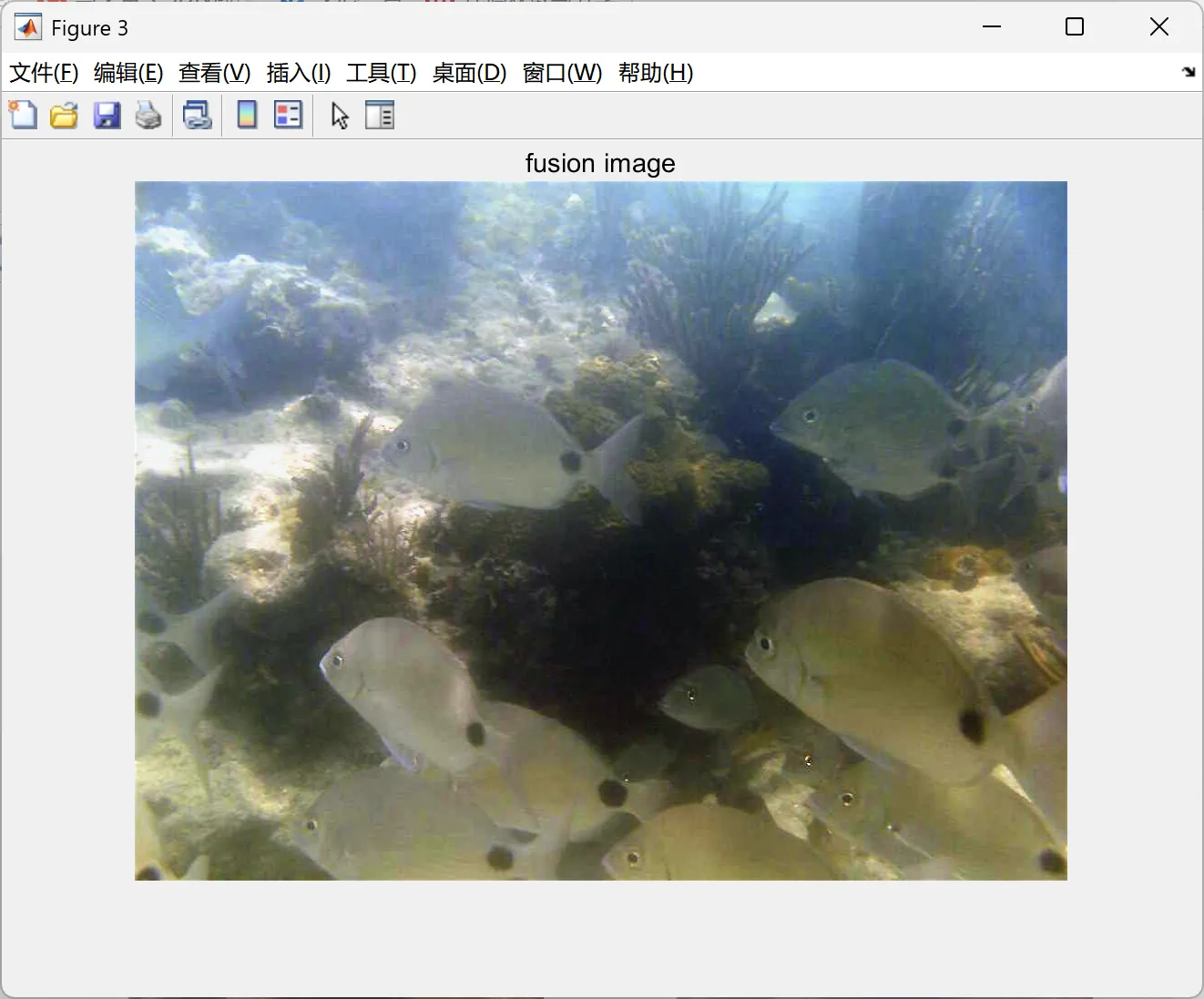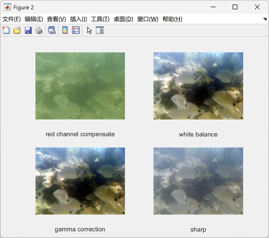 部分代码: % blue channel recover % In murky waters or high water levels or the presence of plankton in abundance that causes the blue channel to attenuate strongly,Supplement the blue channel % im1 = blueCompensate(im1); % subplot(2,3,3) % imshow(im1); % xlabel('blue channel compensate') % white balance enhancement im2 = simple_color_balance(im1); subplot(2,2,2) imshow(im2); xlabel('white balance'); % gamma correction input1 = gammaCorrection(im2,1,1.2); subplot(2,2,3) imshow(input1); xlabel('gamma correction'); % sharpen input2 = sharp(im2); subplot(2,2,4) imshow(input2); xlabel('sharp'); %.................................................% % calculate weight %.................................................% lab1 = rgb_to_lab(input1); lab2 = rgb_to_lab(input2); R1 = double(lab1(:, :, 1)/255); R2 = double(lab2(:, :, 1)/255); % 1. Laplacian contrast weight (Laplacian filiter on input luminance channel) WL1 = abs(imfilter(R1, fspecial('Laplacian'), 'replicate', 'conv')); WL2 = abs(imfilter(R2, fspecial('Laplacian'), 'replicate', 'conv')); % 2. Saliency weight WS1 = saliency_detection(input1); WS2 = saliency_detection(input2); % 3. Saturation weight WSat1 = Saturation_weight(input1); WSat2 = Saturation_weight(input2); % normalized weight [W1, W2] = norm_weight(WL1, WS1, WSat1, WL2 , WS2, WSat2); %.................................................% % image fusion % R(x,y) = sum G{W} * L{I} %.................................................% level = 3; % weight gaussian pyramid Weight1 = gaussian_pyramid(W1, level); Weight2 = gaussian_pyramid(W2, level); % image laplacian pyramid % input1 r1 = laplacian_pyramid(double(double(input1(:, :, 1))), level); g1 = laplacian_pyramid(double(double(input1(:, :, 2))), level); b1 = laplacian_pyramid(double(double(input1(:, :, 3))), level); % input2 r2 = laplacian_pyramid(double(double(input2(:, :, 1))), level); g2 = laplacian_pyramid(double(double(input2(:, :, 2))), level); b2 = laplacian_pyramid(double(double(input2(:, :, 3))), level); % fusion for i = 1 : level R_r{i} = Weight1{i} .* r1{i} + Weight2{i} .* r2{i}; G_g{i} = Weight1{i} .* g1{i} + Weight2{i} .* g2{i}; B_b{i} = Weight1{i} .* b1{i} + Weight2{i} .* b2{i}; end % pyramin reconstruct R = pyramid_reconstruct(R_r); G = pyramid_reconstruct(G_g); B = pyramid_reconstruct(B_b); fusion = cat(3, R,G,B); uiqm = UIQM(fusion) uciqe = UCIQE(fusion) figure,imshow(fusion),title("fusion image");