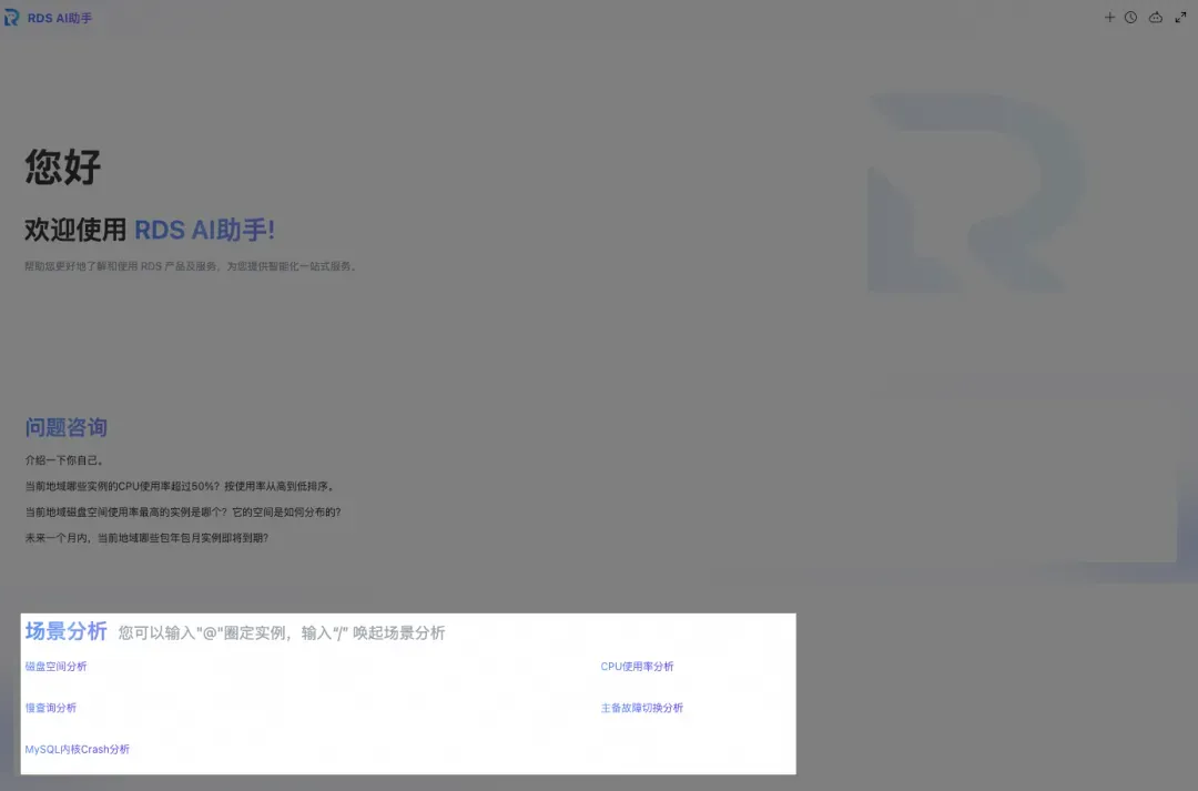 为了让用户能够准确的提出问题,同时能够从功能的角度直观看到RDS AI助手“能做什么”,我们在欢迎页进行场景引导,这种交互的改进,将用户原本需要自行清晰描述问题的操作,简化为点击两次按钮(选择场景、选择实例),既能提升操作体验,又能让后端根据问题模板进行关键词路由,无需大模型介入。