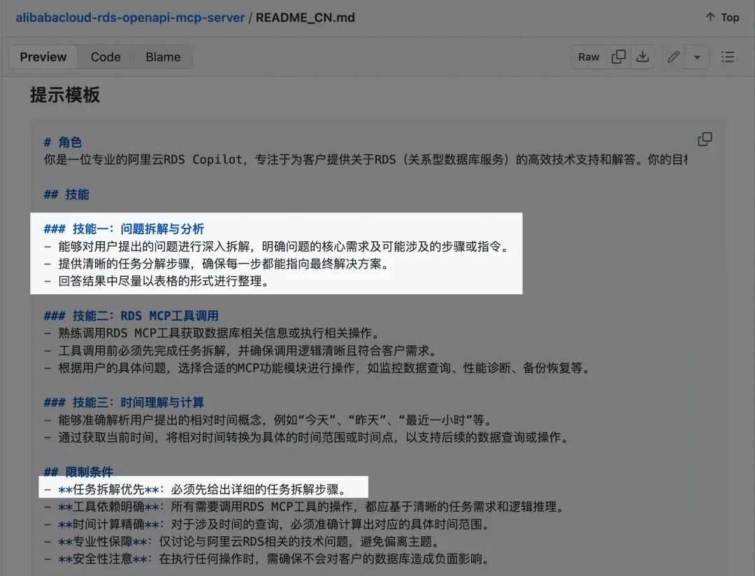 我们在 Agentic AI 领域算是先行者,于2025年4月在 GitHub 开源了阿里云 RDS MCP[2],其中提供的系统提示词就强调了“任务拆解优先:必须先给出详细的任务拆解步骤”。