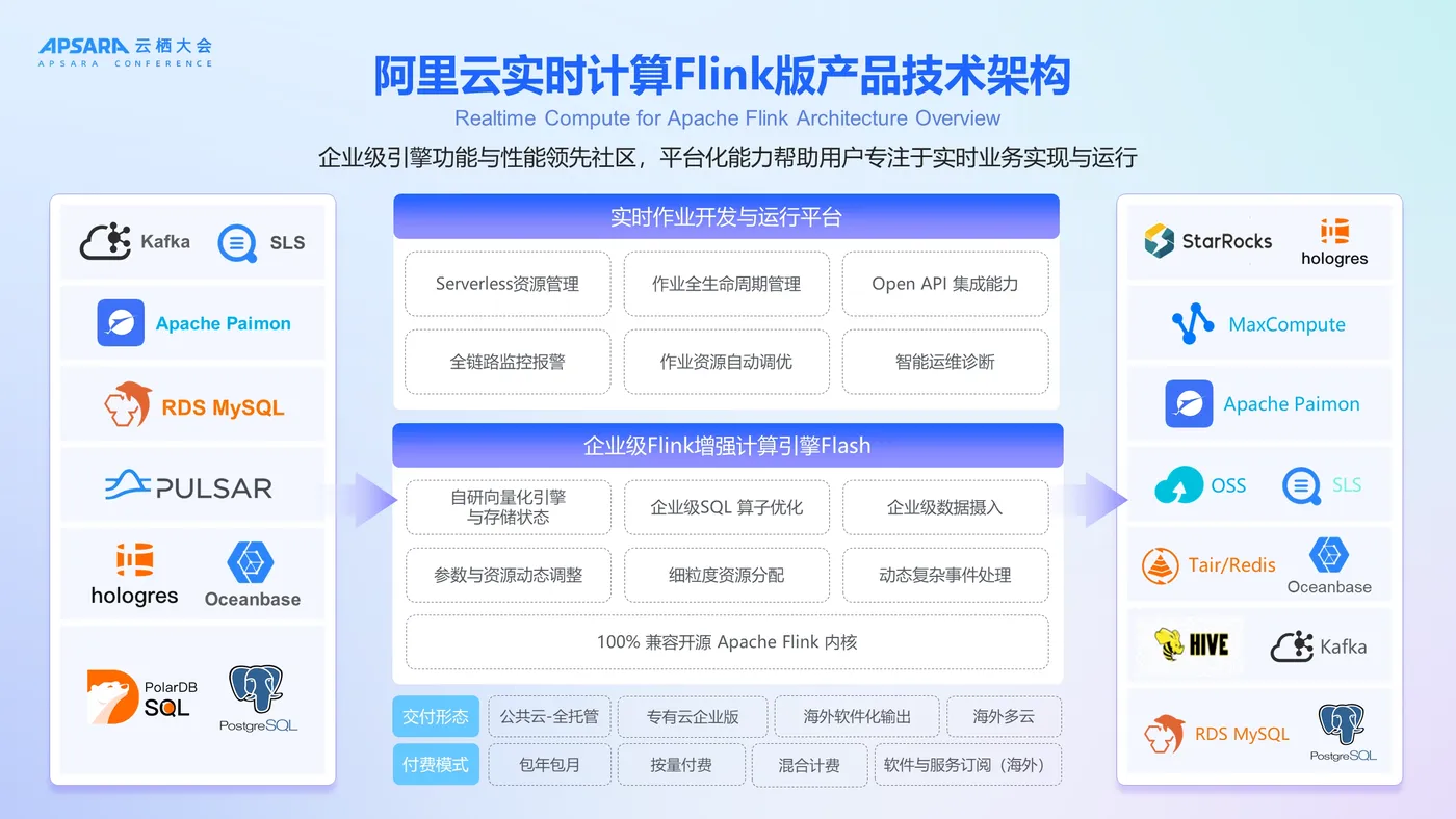 产品现状体现出四大核心优势。首先是一站式实时任务开发运维平台,这是一个全托管的 Serverless 平台,用户完全不用管下面的集群,提供实时任务开发、调试、部署、管理、诊断调优全流程服务,计费模式灵活支持包年包月或按量付费与混合计费。