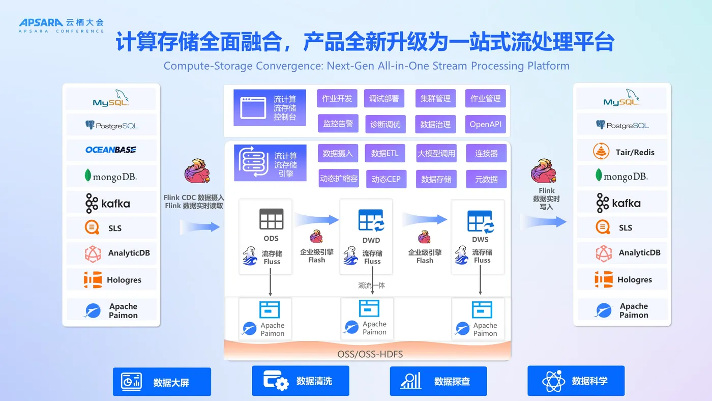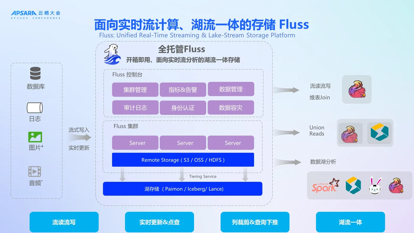 通过计算存储的全面融合,实时计算 Flink 版产品全新升级为一站式流处理平台。产品集成了 Flink CDC 数据摄入、Flink 数据实时读取、流存储 Fluss、湖流一体等能力。在控制台层面提供作业开发、监控告警、集群管理、数据治理、调试部署、诊断调优、作业管理、OpenAPI 等功能。引擎层面包括流计算流存储引擎,支持数据摄入、动态扩缩容、大模型调用、数据存储、数据ETL、动态CEP、连接器、元数据等能力。