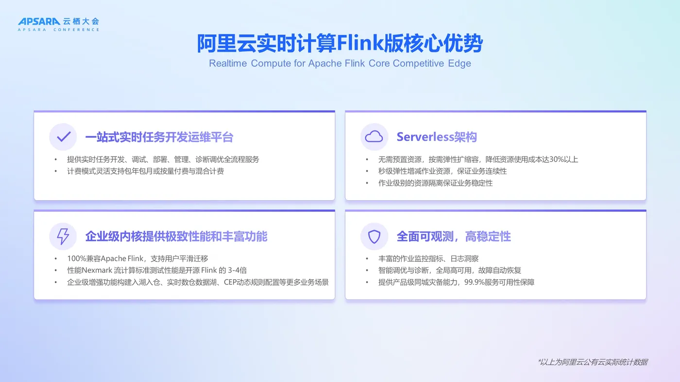 最后是全面可观测性,具备高稳定性、高可用的特点,提供丰富的作业监控指标、日志洞察,智能调优与诊断功能,支持同城灾备,全局高可用,故障自动恢复,提供产品级同城灾备能力,99.9%服务可用性保障,能够给企业级实时业务赋能。
