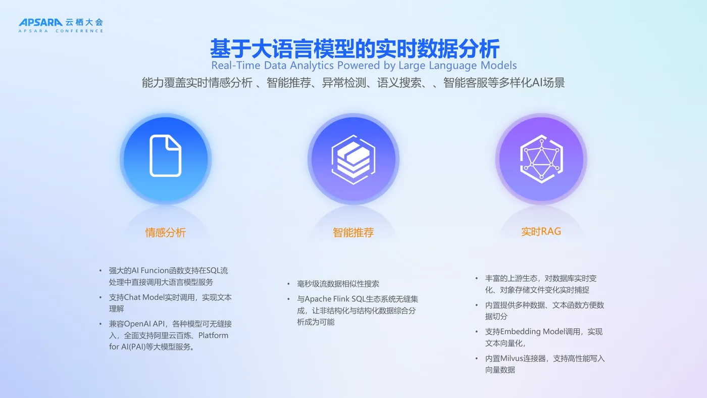 这些能力覆盖实时情感分析、智能推荐、异常检测、语义搜索、智能客服等多样化 AI 场景。基于实时 + AI 能力,可支持多样化的智能场景,包括实时情感分析(社交媒体、客户反馈的实时情感监控)、智能推荐(基于用户实时行为的个性化推荐)、异常检测(业务指标、系统性能的实时异常识别)、语义搜索(基于向量相似性的智能搜索)、智能客服(结合实时上下文的对话机器人)等。