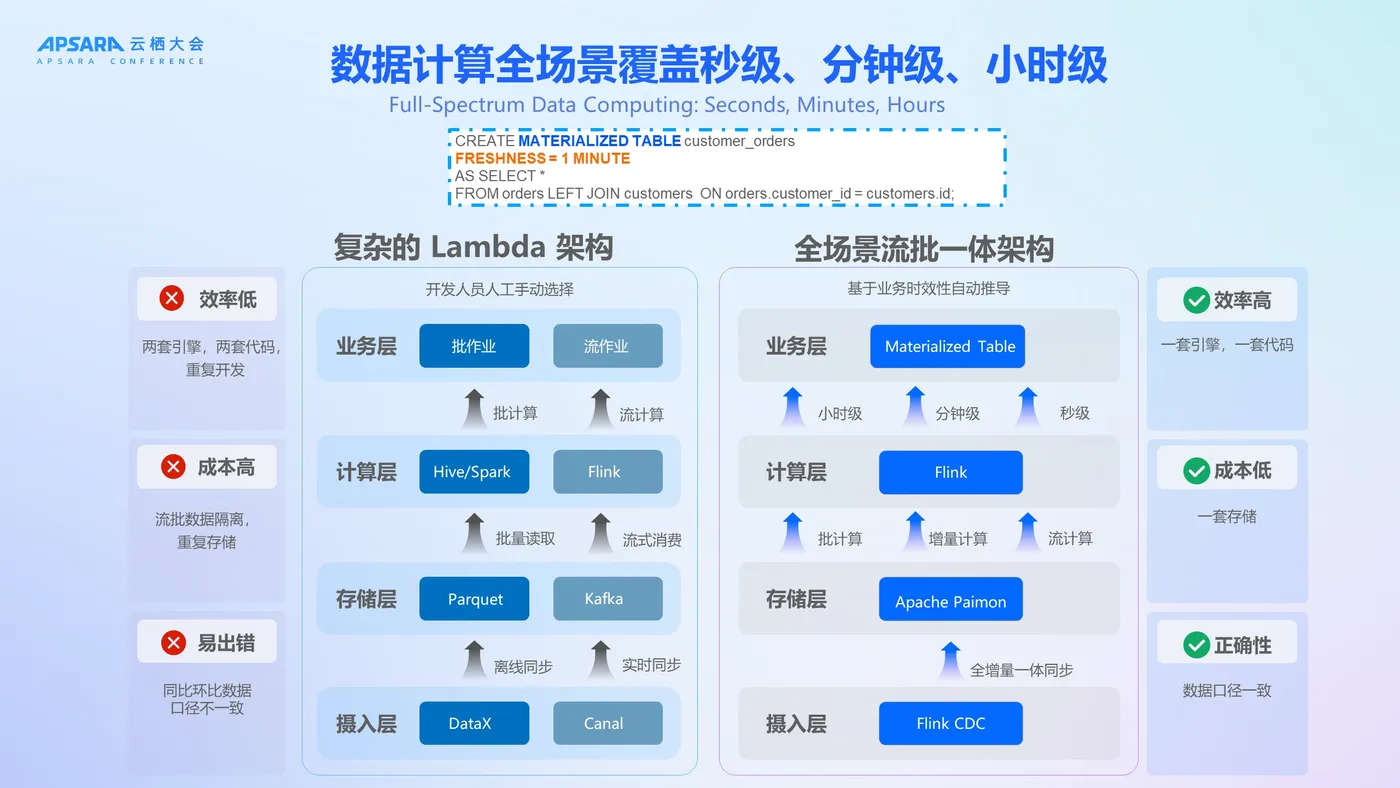 传统的 Lambda 架构存在批处理和流处理割裂的问题,有批处理作业和实时作业,存储、计算都是割裂的。阿里云推出的 UniFlow 统一计算架构通过 Materialized Table 概念,实现了流批一体。通过声明式语法把秒级、分钟级以及天级的计算统一到一起,用户只用调整 Freshness,就能得到不同新鲜度的数据。这个架构基于 Apache Paimon 湖存储,使用 Flink CDC 做数据接入。整体架构更加统一、优雅,成本、效率和正确性都能得到很好的平衡和保证。开发人员不再需要人工手动选择,而是基于业务时效性自动推导,实现了数据计算全场景覆盖秒级、分钟级、小时级。