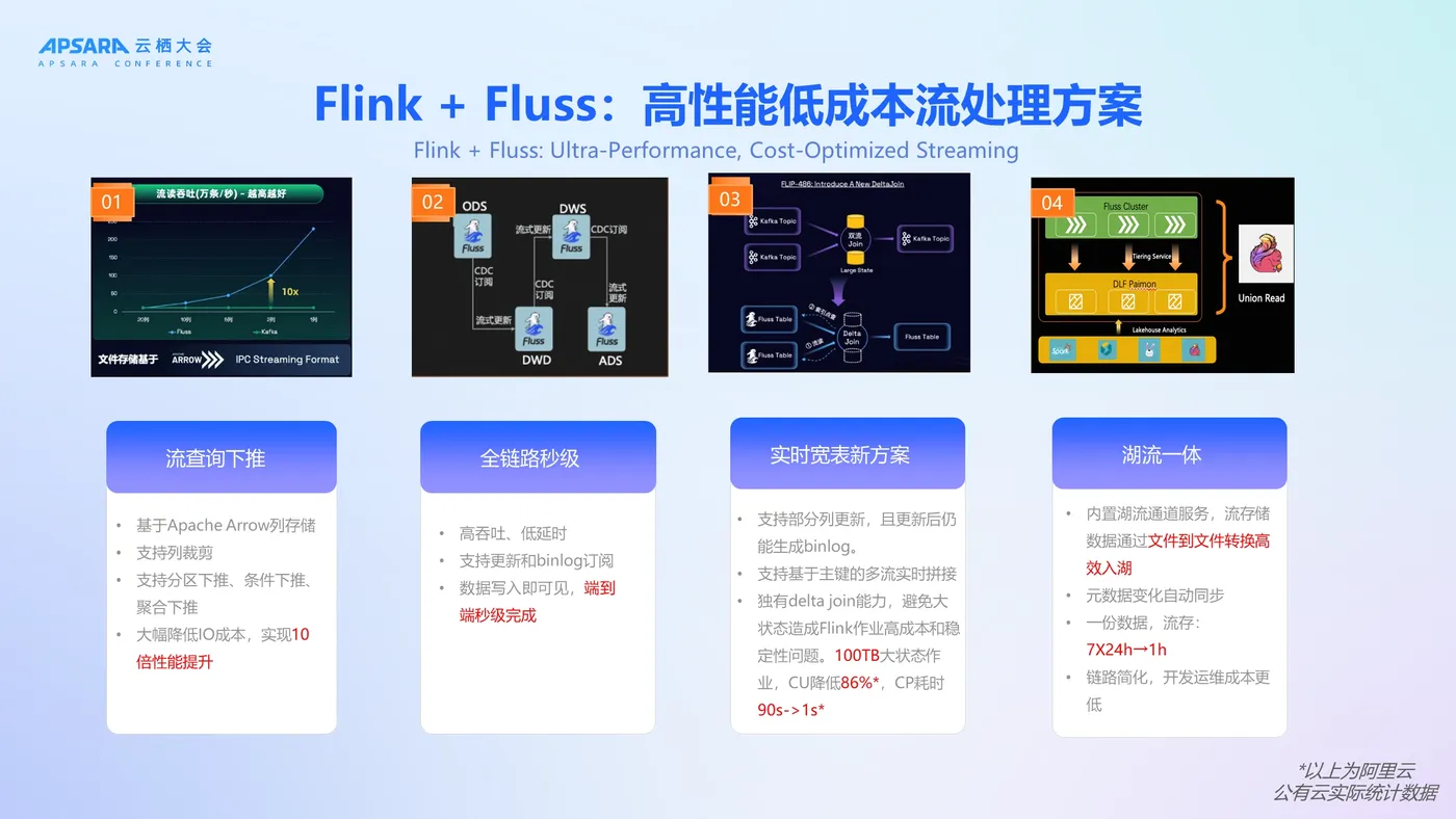 第三是秒级数据延迟,流存储 Fluss 版采用云原生架构,设计之初就考虑稳定性和低延迟性,能做到秒级。支持更新和 binlog 订阅,数据写入即可见,端到端秒级完成,相比传统方案异常概率更低,运维成本更低。