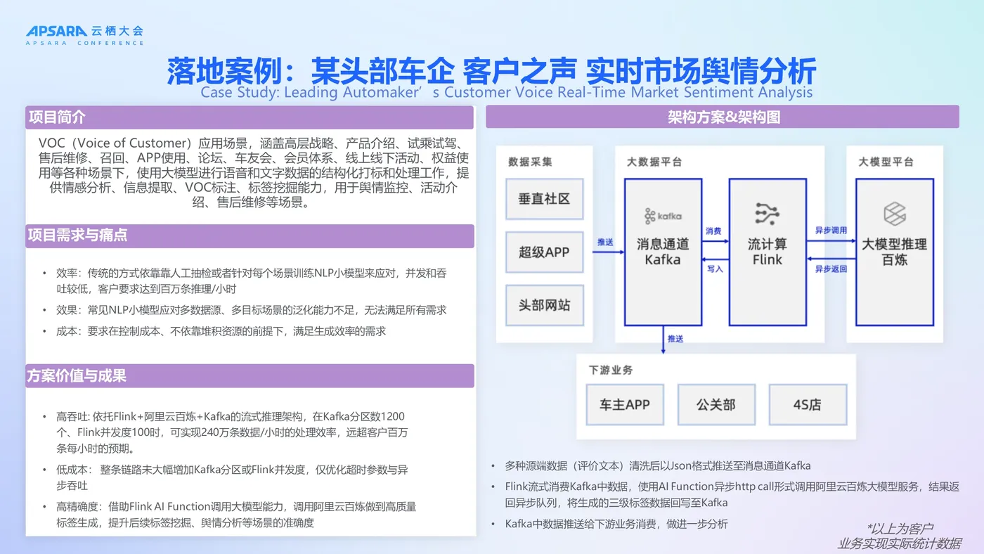 方案价值与成果显著:高吞吐方面,依托实时计算 Flink 版+阿里云百炼+Kafka 的流式推理架构,在 Kafka 分区数1200个、Flink 并发度100时,可实现240万条数据每小时的处理效率,远超客户百万条每小时的预期;低成本方面,整条链路未大幅增加 Kafka 分区或 Flink 并发度,仅优化超时参数与异步吞吐;高精确度方面,借助 Flink AI Function 调用大模型能力,调用阿里云百炼做到高质量标签生成,提升后续标签挖掘、舆情分析等场景的准确度。