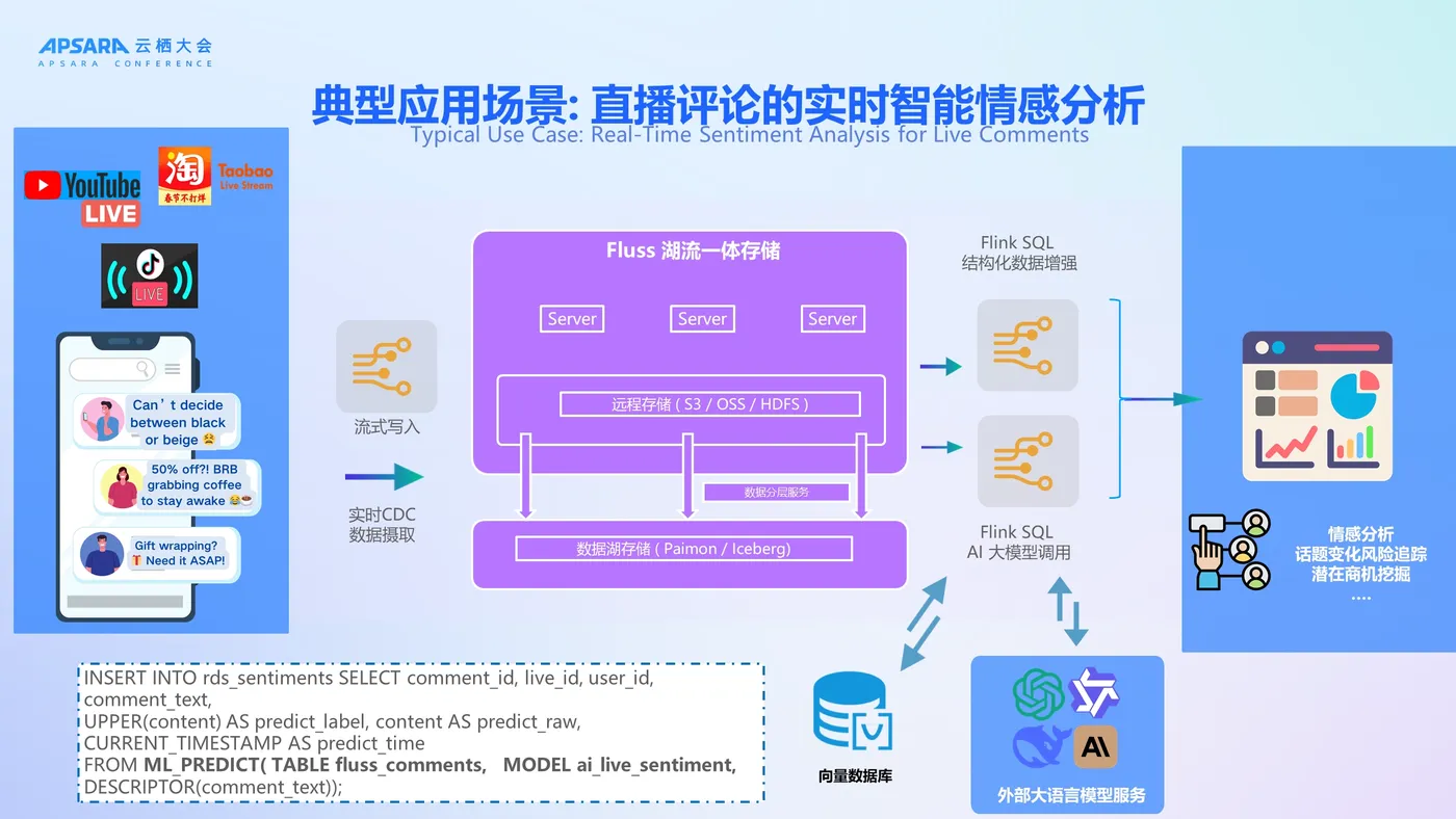 在典型应用场景方面,以直播评论的实时智能情感分析为例。通过 Flink SQL AI 大模型调用,结合外部大语言模型服务和 Fluss 湖流一体存储,可以进行情感分析、话题变化风险追踪、潜在商机挖掘等分析。同时用 Flink SQL 进行结构化数据增强,将结果写入向量数据库。具体的 SQL 语句示例展示了如何通过 ML_PREDICT 函数调用 AI 模型进行实时情感分析。