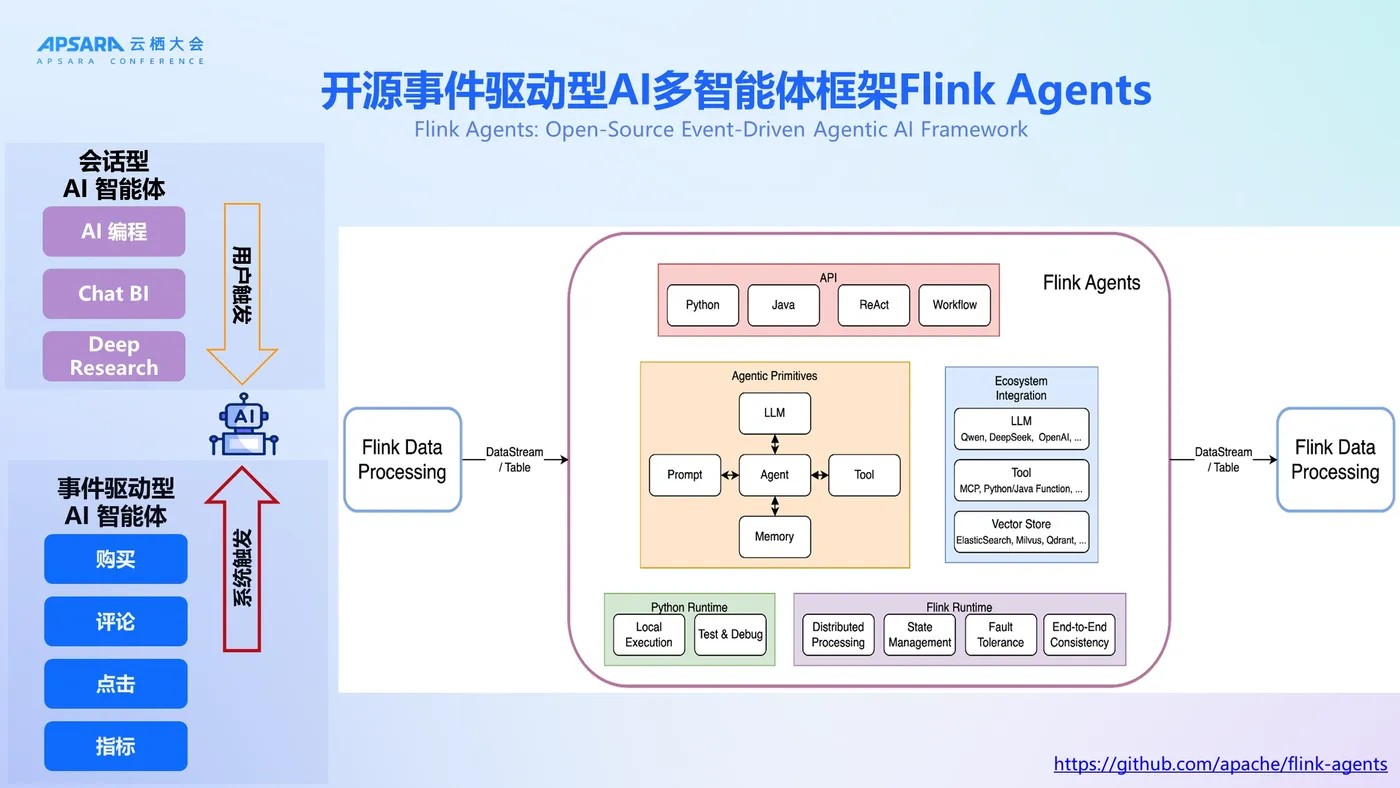 阿里云在 Apache Flink 社区发起了事件驱动型 AI 多智能体框架 Flink Agents,可以支持事件驱动型 AI 智能体、AI 编程、Chat BI、Deep Research 等多种应用场景。这个框架能够处理购买、评论、点击等各种用户触发和系统触发的指标事件,支持会话型 AI 智能体和事件驱动型 AI 智能体。