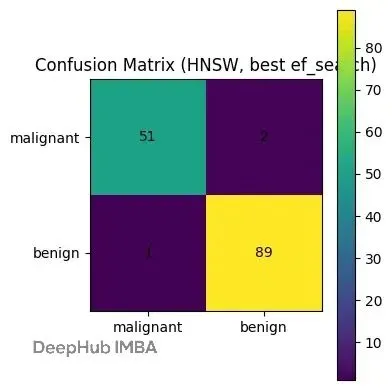 混淆矩阵很直白:2个假阴性,1个假阳性。和暴力k-NN完全一个水平。诊断质量没打折扣,但临床系统或下游应用不用再等那么久。