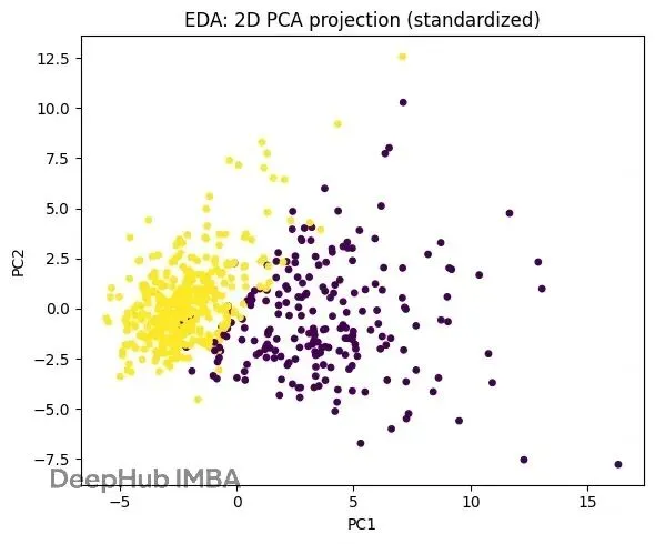 这个脚本演示了如何用HNSW替代UCI乳腺癌数据集上的暴力k-NN。完整流程包括:加载数据,用2D PCA做快速EDA揭示聚类结构,标准化特征,可选地应用PCA生成紧凑嵌入(基于距离的方法对尺度很敏感)。