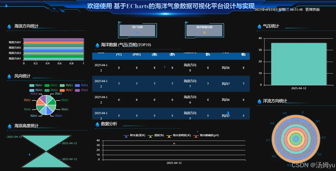 随着全球气候变化的日益加剧,海洋气象的监测与预警成为了重要的研究方向。海洋气象数据包括海面温度、风速、气压、海浪高度等多个维度,准确的气象数据不仅能够为渔业、航运、海洋能源等行业提供决策支持,还能够为自然灾害预警和气候变化研究提供重要依据。然而,海洋气象数据的量大、维度多,如何有效地展示和分析这些复杂的数据,成为当前科学研究和实际应用中的一大挑战