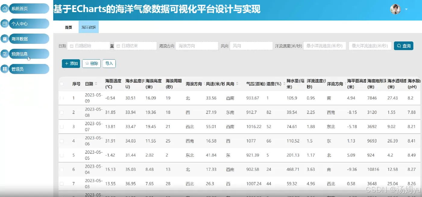 ECharts作为一款开源的可视化图表库,具备高效、交互性强、适应性广等特点,能够有效地解决复杂数据的展示问题。因此,设计并实现一个基于ECharts的海洋气象数据可视化平台,可以为科研人员、决策者提供更加直观、易于操作的分析工具,帮助他们更好地理解海洋气象变化。