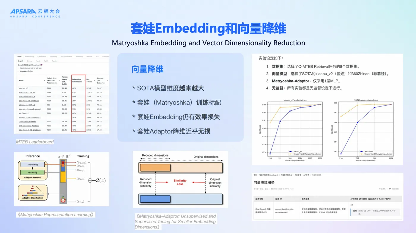 针对向量检索中高维度带来的存储与计算压力,阿里云实现套娃 Adaptor 技术,通过在 Embedding 模型后添加轻量级 MLP 映射层,在无监督场景下将向量维度压缩至 512 维的同时保持近似完整向量的精度。