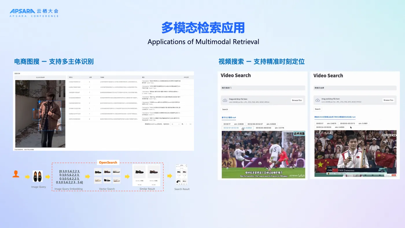 多模态检索技术已经在多个领域展现出巨大价值。在零售电商中,通过图像理解与多主体识别,用户可以“以图找货”,快速匹配相似商品;在视频处理场景中,可以通过语义检索精准定位到视频中的目标画面,实现秒级直达。