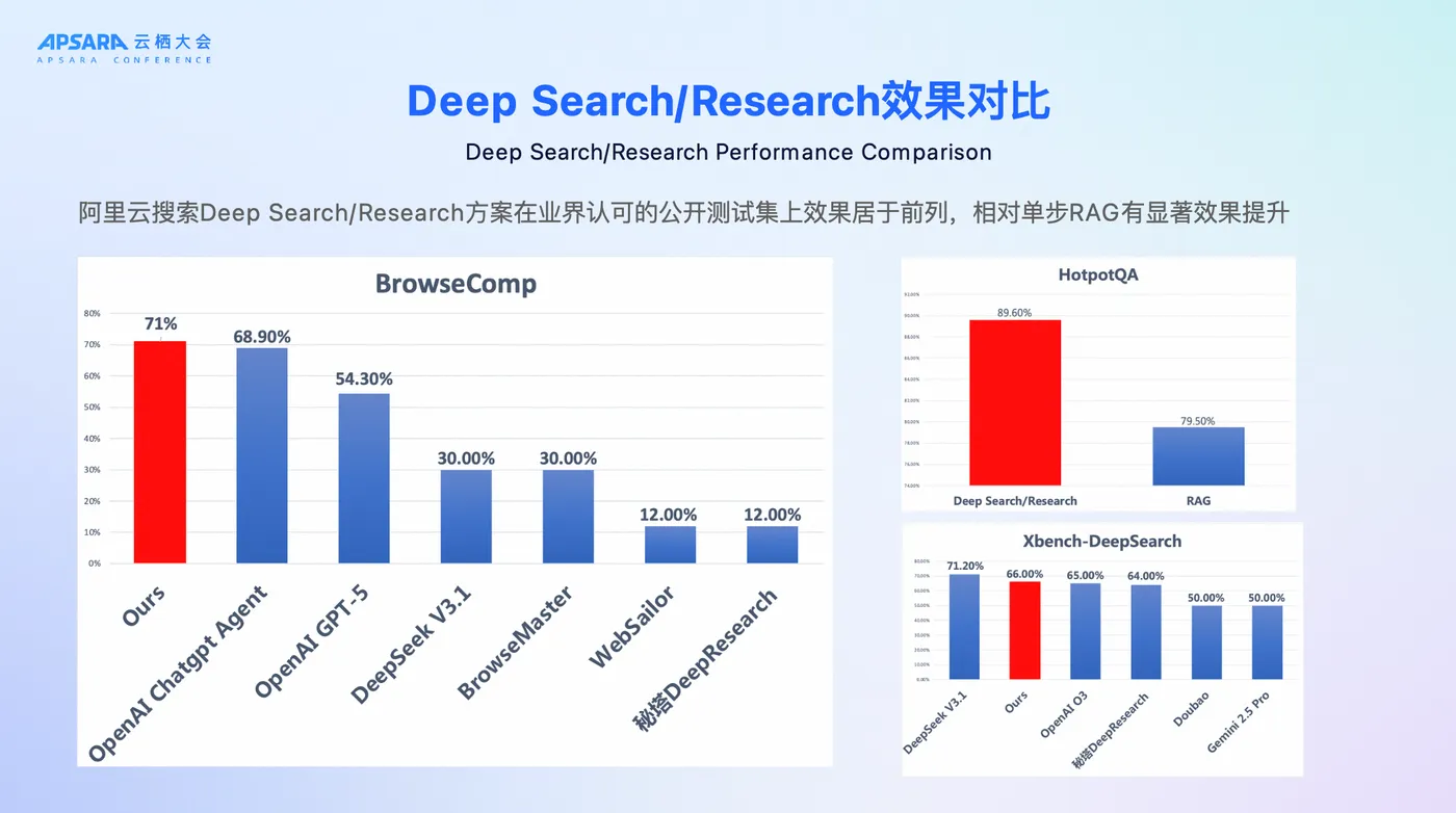 在权威基准评测中,阿里云 Deep Search/Research 展现了强大的跨任务适应性和复杂问题处理能力。无论是在多轮深度检索任务(BrowseComp)、多跳推理任务(HotpotQA),还是综合搜索评估(Xbench-DeepSearch)中,该方案都稳居行业前列,并较传统单步 RAG 模式实现大幅性能提升。这证明了其在任务分解、多工具协作、记忆驱动推理等创新机制上的显著优势,为科研分析、竞争情报、深度数据研究等高难度应用场景提供了更高准确率与更稳健的解决方案。