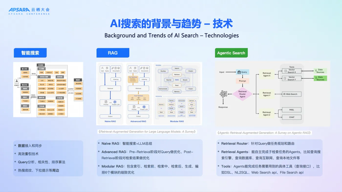 徐光伟指出,AI搜索技术经历了三个关键阶段:传统智能搜索(全网/垂类/云端搜索)——RAG 增强搜索(结合大模型生成能力)——快速发展的 Agentic Search(代理式动态搜索)。