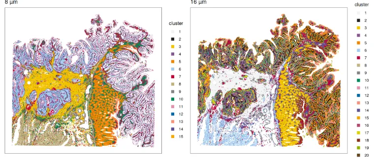 我们可以在 8 µm 和 16 µm 分辨率下可视化给定的聚类结果。稍后,我们将比较 16 µm 处的聚类结果与 Banksy 的聚类结果。
