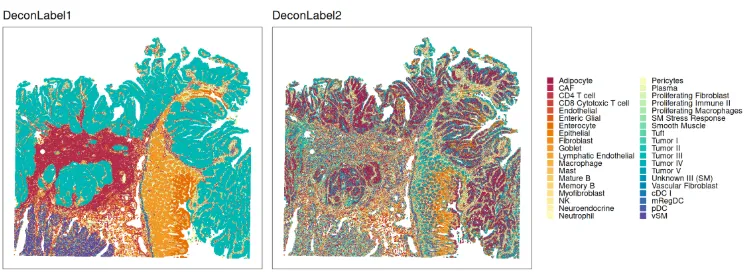 这些数据附带由 spacexr 中实现的 RCTD去卷积估算得到的 bin 级注释。具体而言,提供两组标签,分别对应每个 bin 内 38 种细胞类型中出现频率最高和第二高的类型: