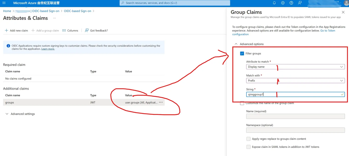 3)在Additional Claims 部分,选择groups,在右侧弹出页面中的 Advanced Options中,启用Filter Groups