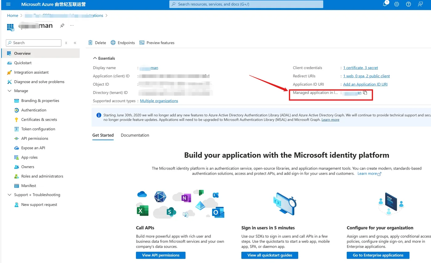 1) 进入Azure Entra ID页面,进入到“注册应用”页面,在 概述(overview)页面上点击“Managed Application in ....”,进入此应用的“企业应用”页面