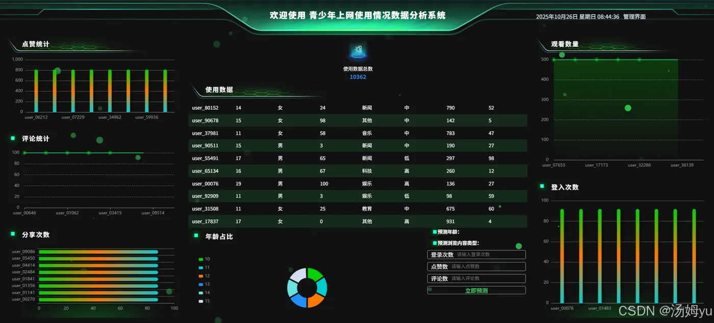 随着互联网技术的深度渗透,青少年已成为数字社会的核心用户群体。截至2025年,中国青少年网民规模已突破2.8亿,日均上网时长超过4.2小时,网络行为呈现多元化、碎片化特征。然而,青少年网络使用存在显著矛盾:一方面,网络为教育、社交、娱乐提供了便捷平台;另一方面,过度依赖、网络暴力、信息泄露等问题频发,引发社会广泛关注。国家网信办数据显示,2025年因网络沉迷导致的青少年心理问题案例同比增长27%,凸显防沉迷系统优化的紧迫性。现有青少年模式虽通过时长限制、内容过滤等手段进行管控,但存在三大短板:其一,用户行为画像模糊,平台难以精准识别日均使用时长、内容偏好等关键指标;其二,风险预警滞后,对超时使用、接触不良信息等行为缺乏实时干预能力;其三,决策依据分散,政策制定者缺乏量化工具评估防沉迷效果。例如,Bilibili青少年模式虽覆盖92%的青少年用户,但平台管理者仍需通过人工抽样分析用户行为,效率低下且易遗漏关键模式。Python凭借其强大的数据处理能力与生态优势,为破解上述难题提供了技术支撑。Pandas、NumPy等库可高效处理TB级用户行为日志,Scikit-learn、TensorFlow等机器学习框架能构建预测模型,结合Hadoop、Spark实现分布式计算,可实时分析亿级数据。例如,某教育平台通过Python驱动的随机森林算法,将青少年学习行为预测准确率提升至89%,为个性化干预提供科学依据。本研究旨在构建基于Python大数据的青少年网络使用分析系统,填补现有防沉迷体系的技术空白,推动数字治理从“经验驱动”向“数据驱动”转型。