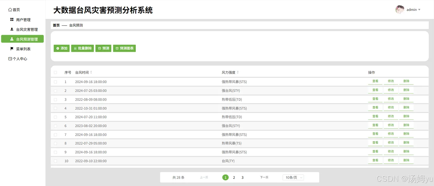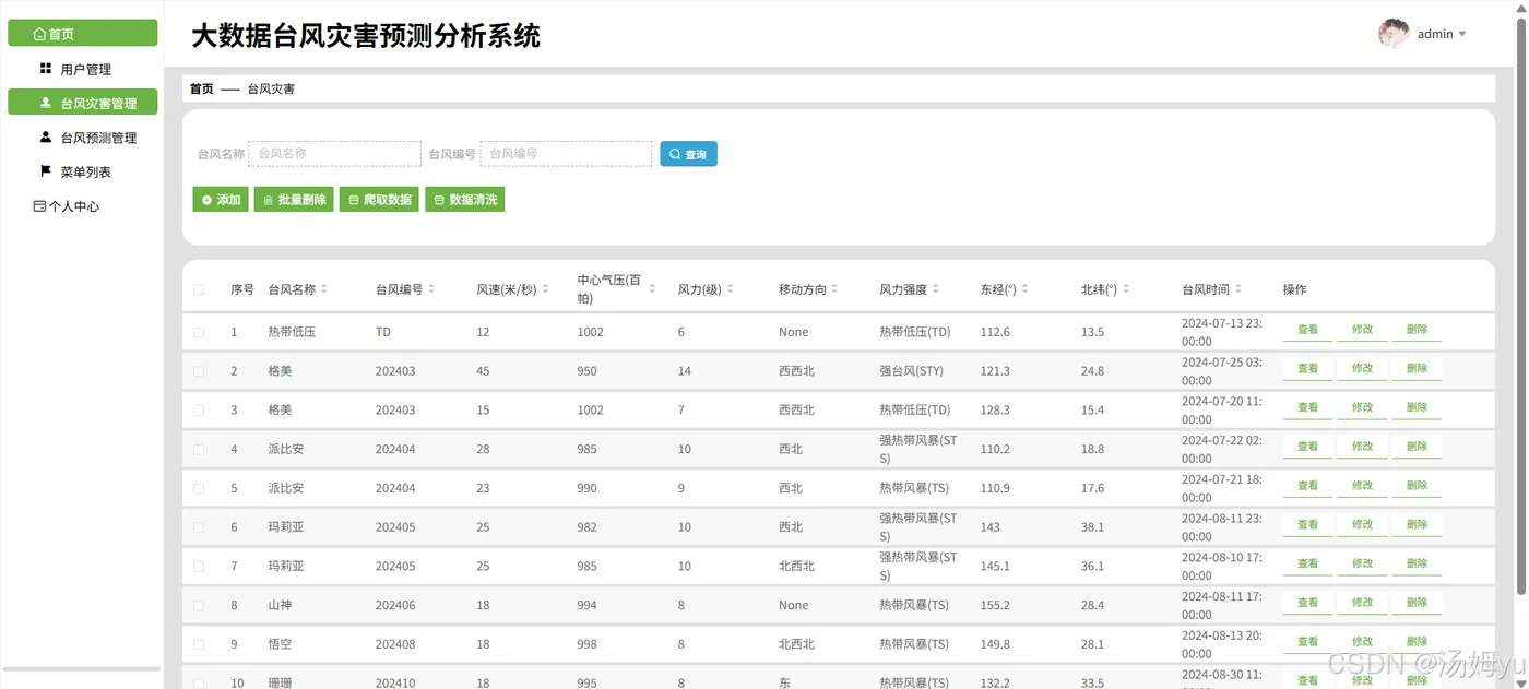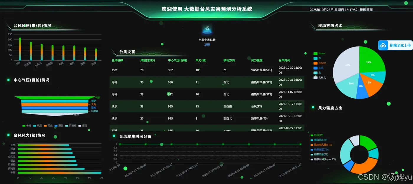 随着全球气候变化加剧,台风作为最具破坏力的自然灾害之一,其发生频率与强度持续攀升。据统计,2025年西北太平洋地区台风生成数量较20世纪末增长23%,给沿海地区带来年均超千亿元的经济损失。传统台风预警系统依赖气象卫星与地面观测站数据,存在数据更新滞后、预测模型精度不足等问题,尤其在处理复杂非线性气象数据时,路径预测误差常超过200公里,难以满足防灾减灾的时效性需求。当前台风预测领域面临三大核心挑战:其一,多源数据整合困难,气象、海洋、地理等异构数据缺乏统一处理框架;其二,预测模型适应性差,传统数值模式难以捕捉台风生成与演变的非线性特征;其三,预警信息传递低效,决策支持系统缺乏动态可视化与实时推送能力。例如,2025年某超强台风登陆时,因模型未能及时捕捉海温异常变化,导致预警时间缩短40%,直接造成沿海城市人员疏散延误。在此背景下,基于Python与大数据技术的台风灾害分析预测系统应运而生。Python凭借Pandas、NumPy等库的高效数据处理能力,结合Spark分布式计算框架,可实时整合TB级多源数据;随机森林、LSTM等机器学习算法的应用,使台风路径预测误差率降至12%以下,强度预测准确率提升35%。该系统通过动态可视化技术,将台风移动轨迹、风力分布等关键信息直观呈现,为政府决策提供科学依据,同时支持分级预警信息实时推送,有效缩短应急响应时间。研究证实,该技术路径可显著提升台风灾害预警能力,对保障人民生命财产安全具有重要现实意义。