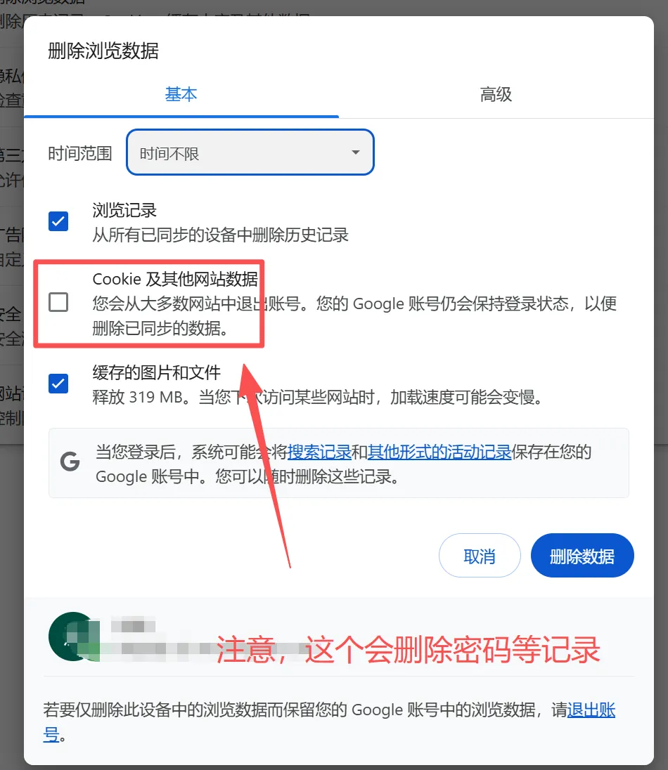 - 勾选“缓存的图片和文件”“Cookie 及其他网站数据”,时间范围选择“所有时间”,点击“清除数据”。