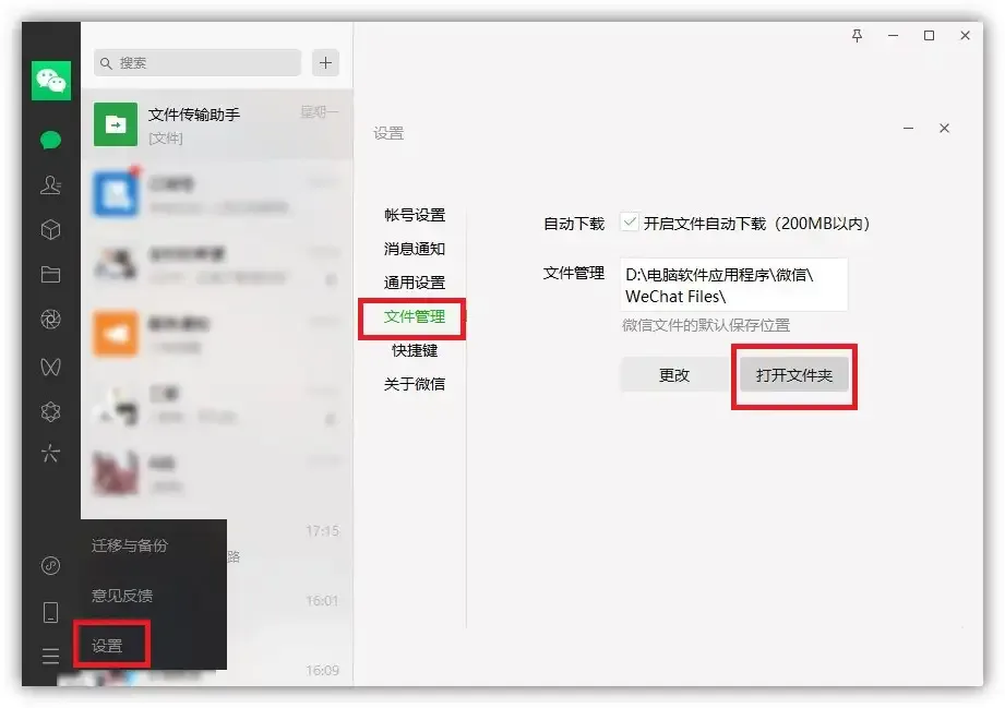 打开微信中的设置。选择【文件管理】->【打开文件夹】