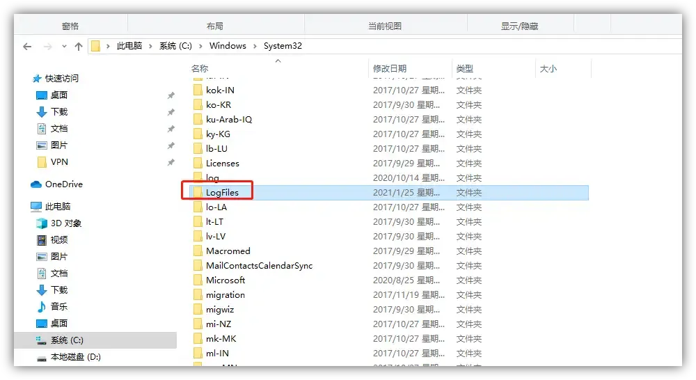 打开C盘,点击【Windows】→【system32】→【Logfiles】,将里面的内容删除。