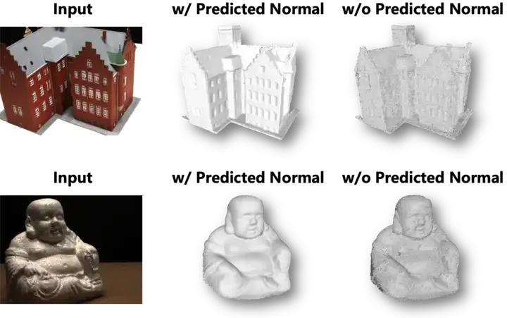 通过端到端多任务协同训练,各任务相互强化。例如,预测的法线图在Poisson表面重建中能产生更清晰的网格细节,而深度和相机约束则互相校准,提升整体几何一致性。