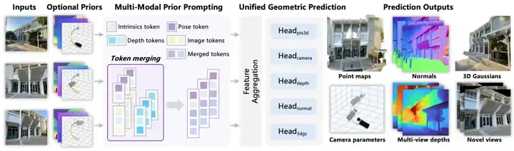 每种先验采用专化编码策略。相机位姿和内参通过MLP投影为单个令牌;深度图通过卷积核生成空间对齐的密集令牌,与视觉特征直接相加。这种异构融合策略既保留了全局约束的稳定性,又维持了局部几何信息的细节。通过动态注入与随机组合训练策略,模型能够灵活适应任意先验组合甚至无先验的输入场景,实现对复杂真实环境的鲁棒解析,大幅提升三维结构一致性与重建质量。