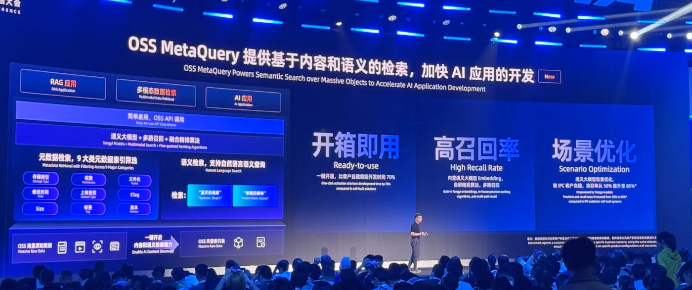 近日,在云栖大会上阿里云 OSS MetaQuery(数据索引)全新升级,支持基于内容和语义的智能检索,面向安防监控、智慧社区、智能零售等场景。企业可快速开启该能力,无需自建基础设施或优化模型,即可自动完成视频、图片、文档等非结构化数据的向量化与索引构建,基于成熟的精排算法和多路召回机制,有效提升检索准确率与召回率,轻松实现 RAG 多模态语义检索和 AI 应用,标志着 OSS 迈入 AI 原生数据管理新时代。