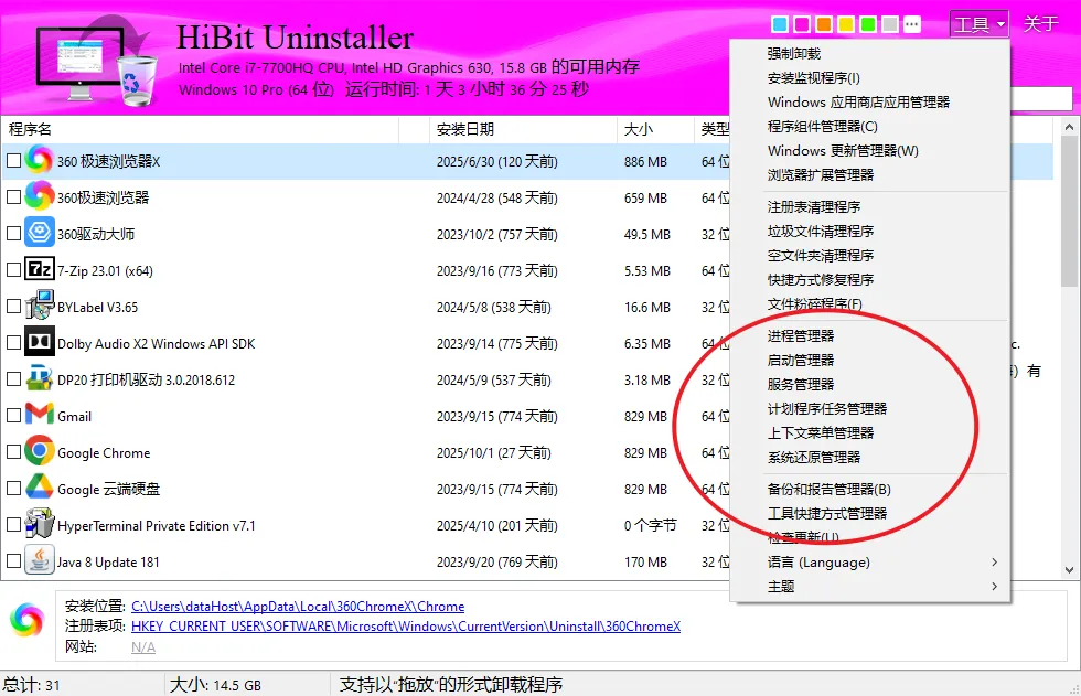 本篇分享一个新工具。从名字上能看出来,这个工具主打卸载,它体积很小,压缩包才 3.85M,下载快,装在电脑里不占空间。而且一直在更新,不会用着突然出问题。界面也简单,顶部栏能换颜色。