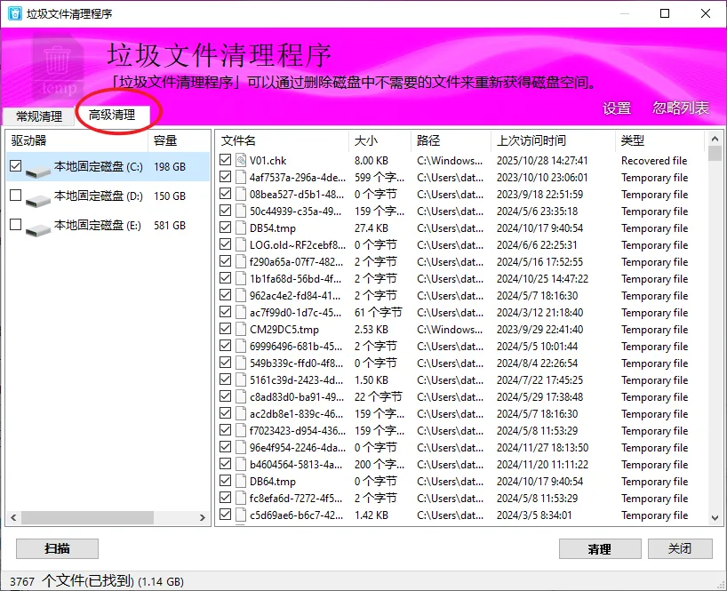 有一个高级清理选项,可以对某个逻辑磁盘进行单独扫描。比如我这里扫描的是C盘。