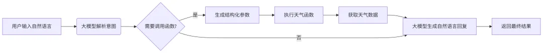 - 第三步(大模型):理解用户意图,判断是否需要调用函数?如果需要,调用哪个函数?