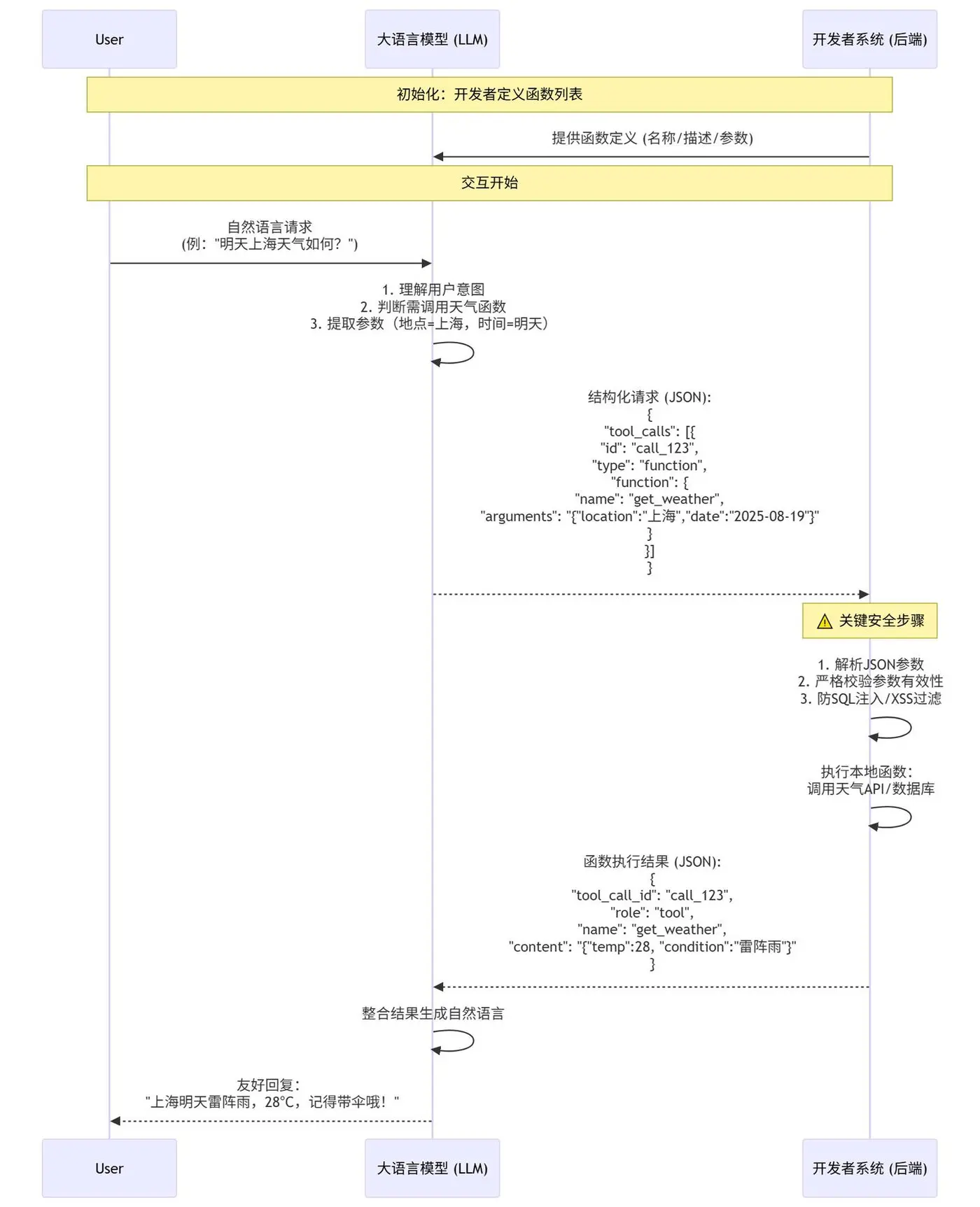 生成结构化请求:输出一个标准的JSON对象,包含明确的function_call信息(name- 函数名,arguments- 符合函数参数定义的JSON字符串)。 - 第四步(开发者):解析大模型输出的JSON,找到对应的函数实现
