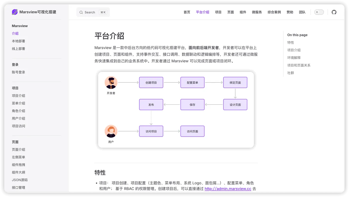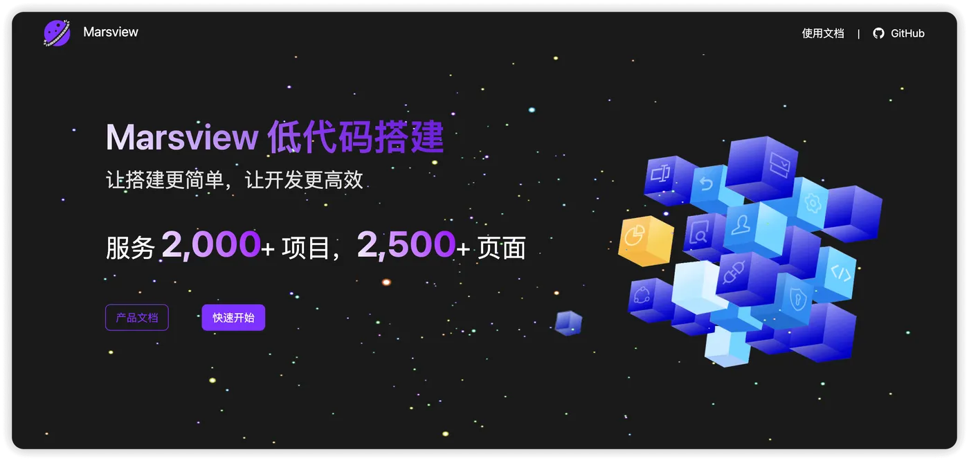 “Marsview 是一款中后台方向的低代码可视化搭建平台,开发者可以在平台上创建项目、页面和组件,支持事件交互、接口调用、数据联动和逻辑编排等”