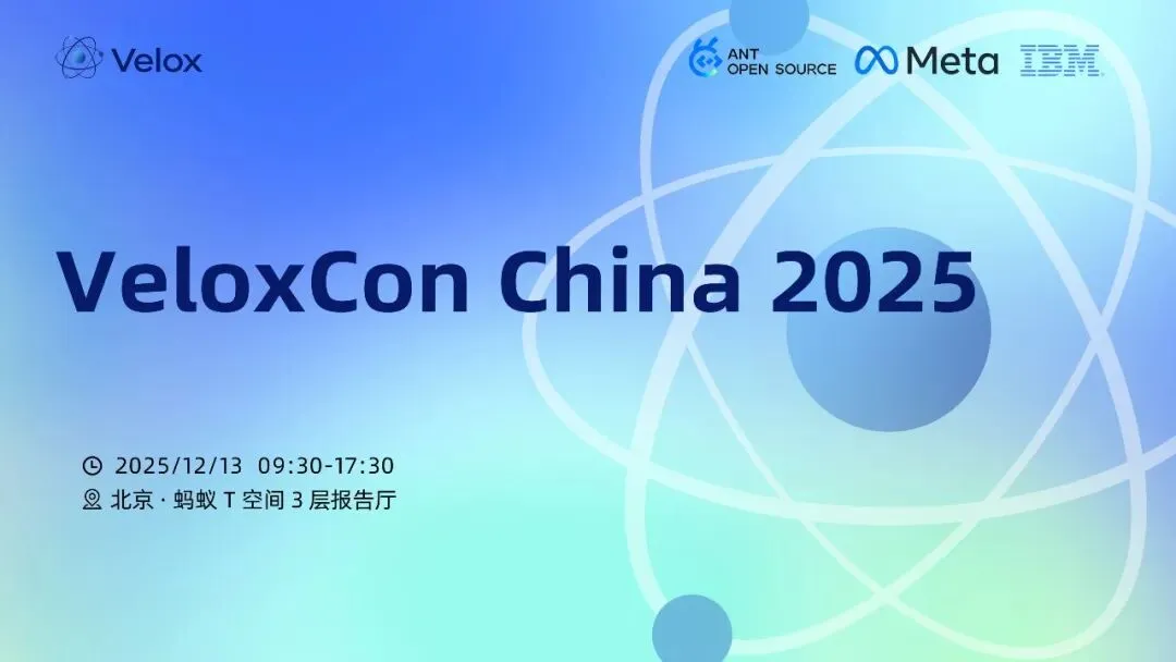 现在,中国数据领域的从业者们迎来了与 Velox 深度对话的绝佳契机:Velox 首届中国大会(VeloxCon China 2025)将于 2025 年 12 月 13 日在北京举办!这场由蚂蚁开源、Meta、IBM 联合主办的技术盛会,将汇聚全球顶尖工程师与社区爱好者,用一天时间解锁数据处理的前沿密码。